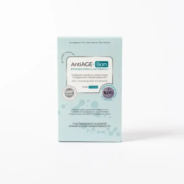 ОПИСАНИЕ: Вместе с общим действием пробиотика — восстановлением микрофлоры кишечника и модуляцией иммунитета — AntiAGE-Biom замедляет процессы старения организма, снижая количество конечных продуктов гликации AGE’s на 90%, восстанавливает поврежденные ткани сосудов, стабилизирует метаболические процессы.